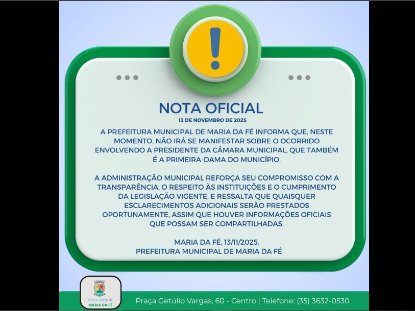 A Prefeitura Municipal de Maria da Fé divulgou nota nesta quinta-feira (13/11), informando que no momento não irá se manifestar sobre o ocorrido envolvendo a Presidente da Câmara Municipal, que também é a primeira da do município e que esclarecimentos adicionais serão prestados oportunamente.